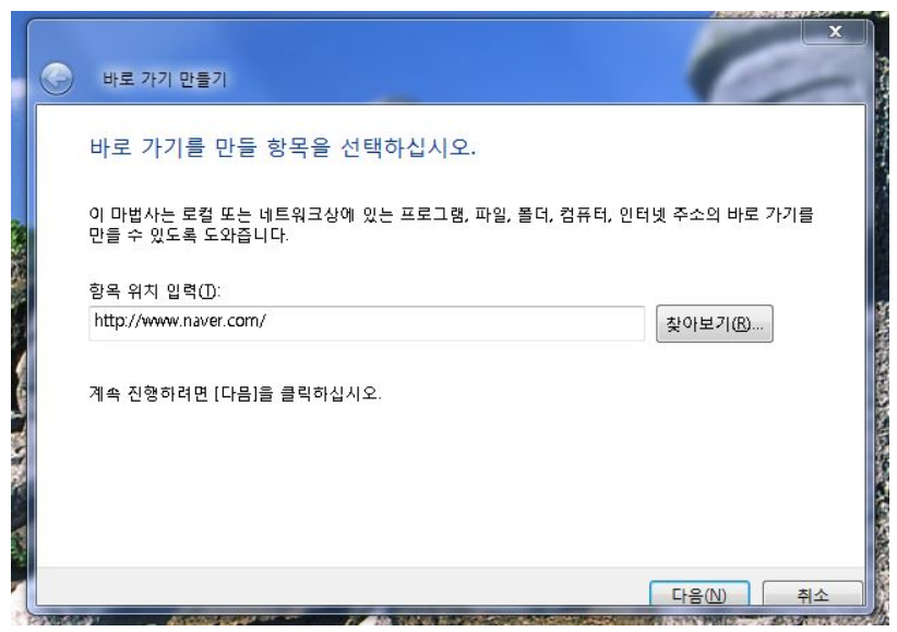 윈도우환경에서 마우스 우클릭에 있는 메뉴에서 새로 만들기 - 바로 가기를 통해서 생성이 가능한데요. 여기에서는 항목 위치에 특정 경로로써 홈페이지 주소를 입력 가능합니다.
