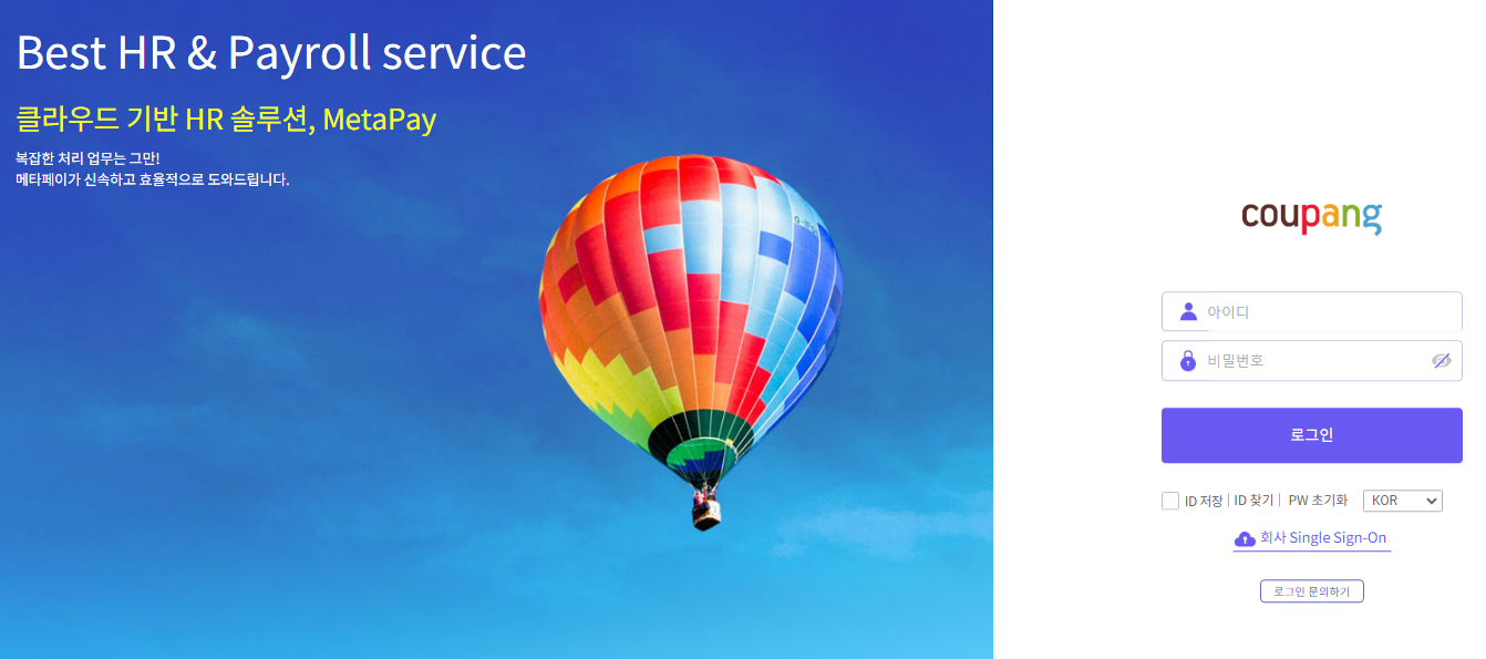 덕분에 미리 아이디와 비밀번호를 확인하신 후 접속을 하여 급여조회나 연말정산과 같은 업무를 진행하시면 됩니다. 그럼 쿠팡풀필먼트서비스 메타페이 잘 활용하시길 바랍니다.