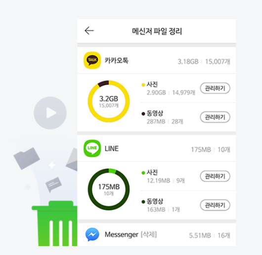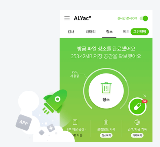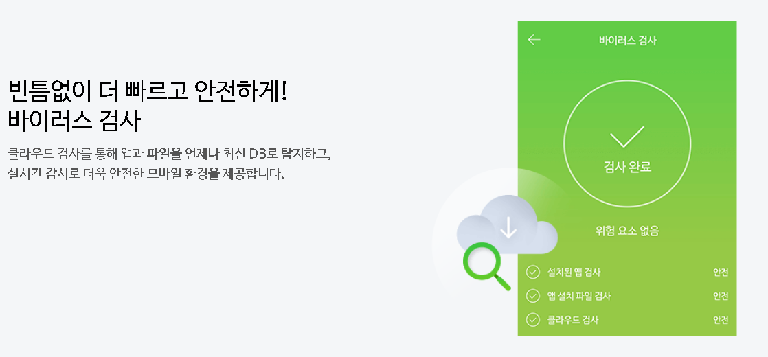 알아보니 pc에서 사용을 하는 알약백신과 마찬가지로 모바일에서 바이러스 검사, 배터리 관리, 청소/메모리, 메신저 파일 정리, 스미싱 탐지, 앱잠금, 앱관리, Wi-Fi 관리 등을 지원하고 있어요.