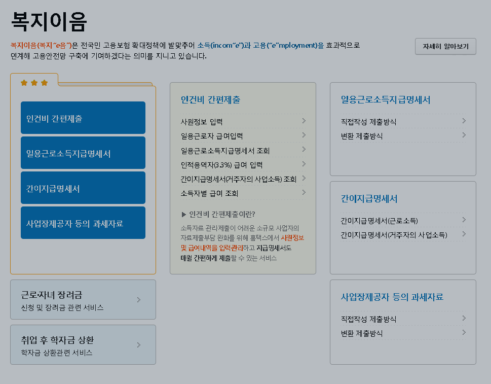 다만 복지이음 서비스와 그 밖에 기본적인 내용 조회 그리고 모의계산은 여전히 지원을 하고 있었어요.