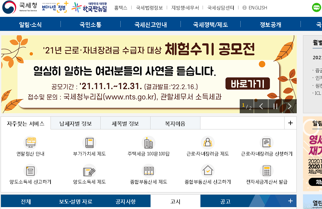 그럼 과연 현재 국세청 홈택스에서는 어떠한 서비스가 진행되어지고 있는지 사이트를 확인하면서 간단하게 알아보도록 할께요.
