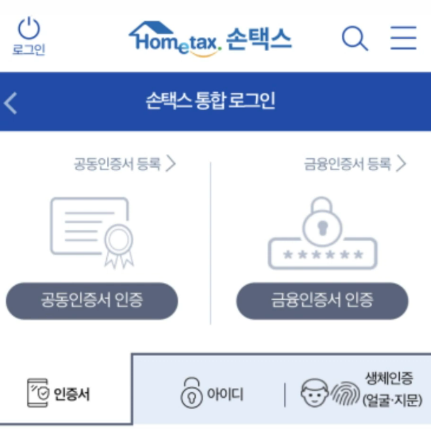 자세한 개인이나 사업자관련 서비스를 확인하기 위해서는 인증서나 아이디를 기반으로 로그인이 필요하였구요.