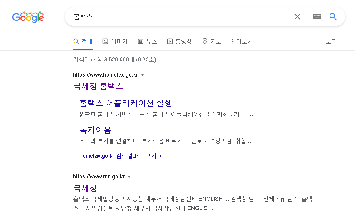 구글, 네이버, 다음 등에서 국세청 홈택스를 검색해본 결과 바로 상단에서 웹사이트를 찾을 수 있었는데요.